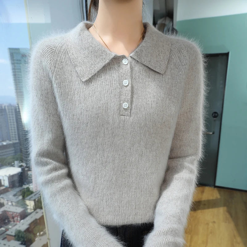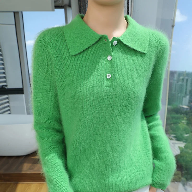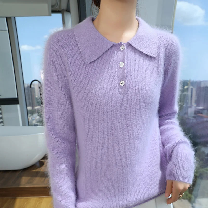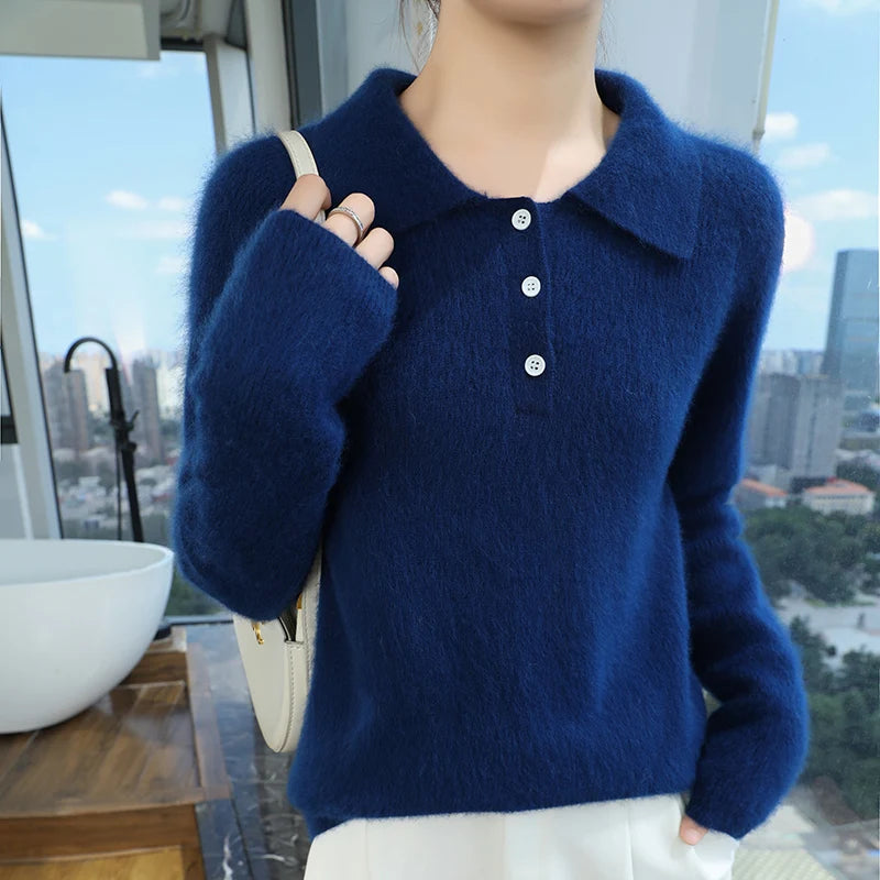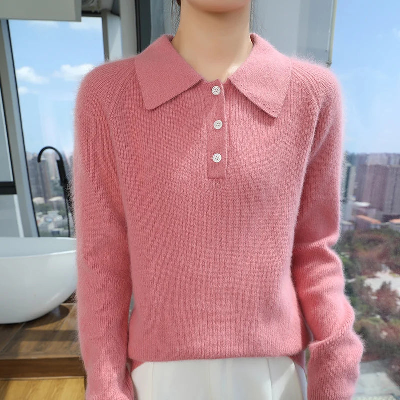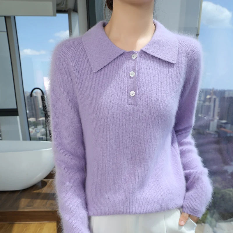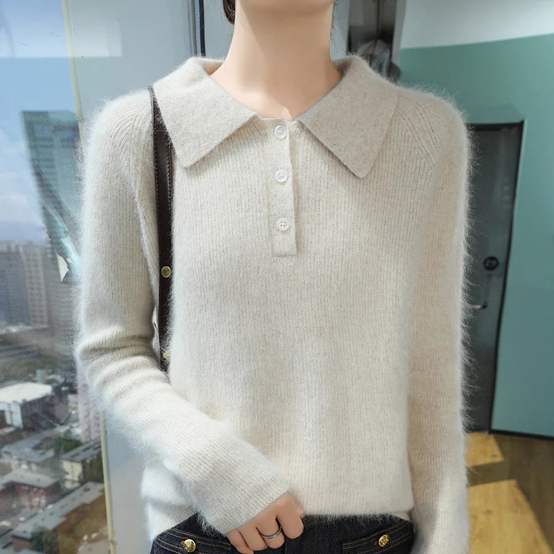 100% Mink Cashmere Women's Pullover Polo Collar Buttoned Sweater Autumn Winter Long Sleeve Knitwear Soft Warm Chic Clothings