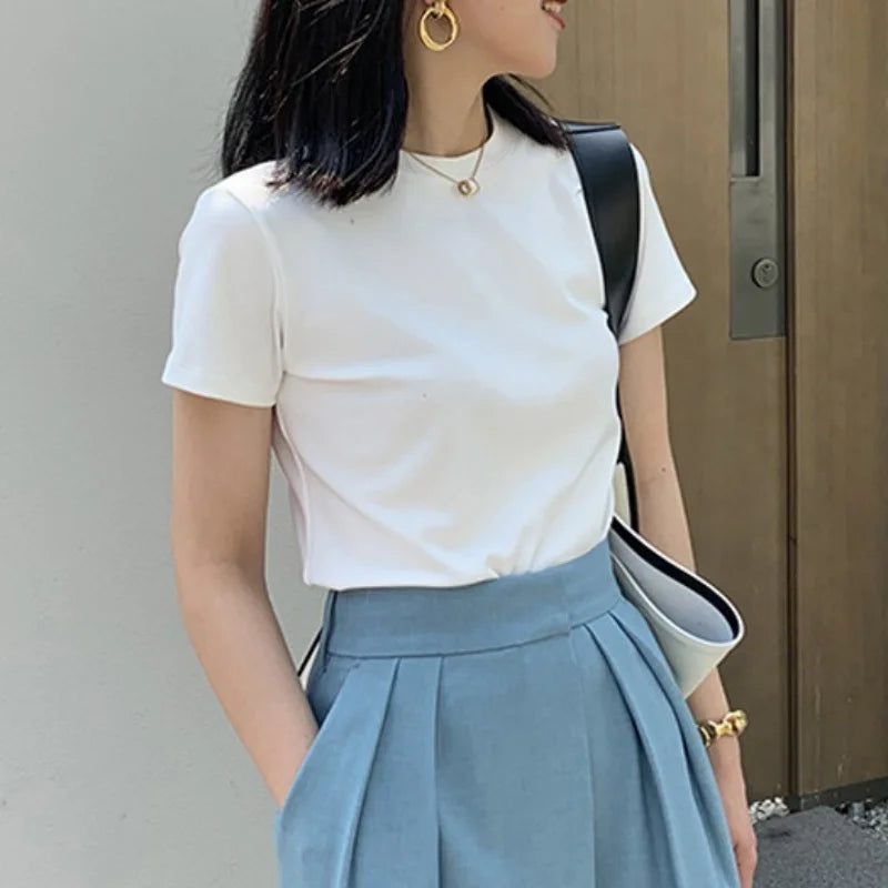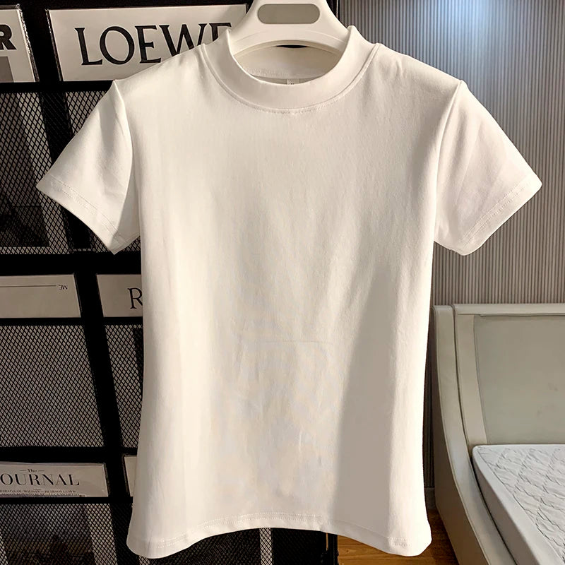 2024 Fashion Women Cotton Half High collar Short Sleeve T-shirts Summer Solid Color Elegant Tee Casual Tops