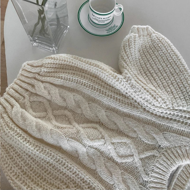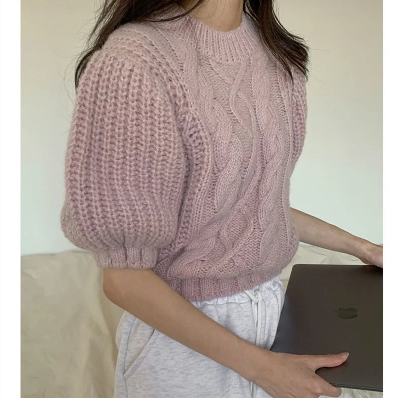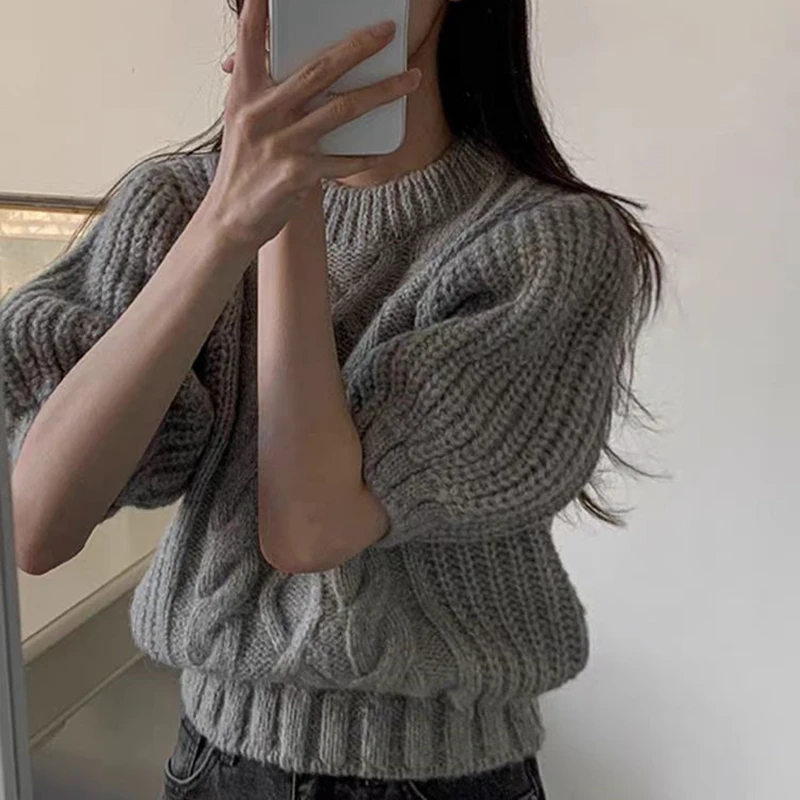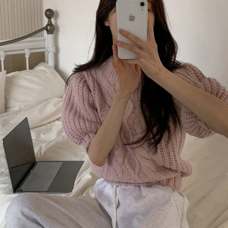 Autumn New Women's Clothing Gentle and Sweet Retro Twist Crew Neck Bubble Sleeve Sweater Knitwear Short Sleeve Top