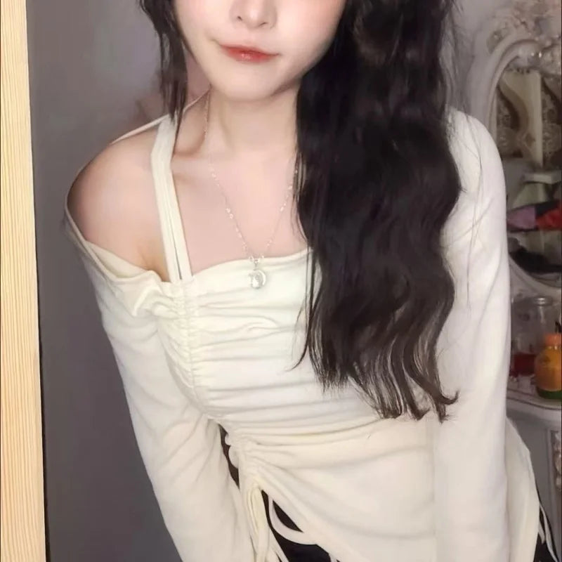 Spring Autumn Cotton Flare Sleeve T Shirts Women Solid Bodycone Basic Long Sleeve Crop Tops Casual Shirring Off-shoulder Tees