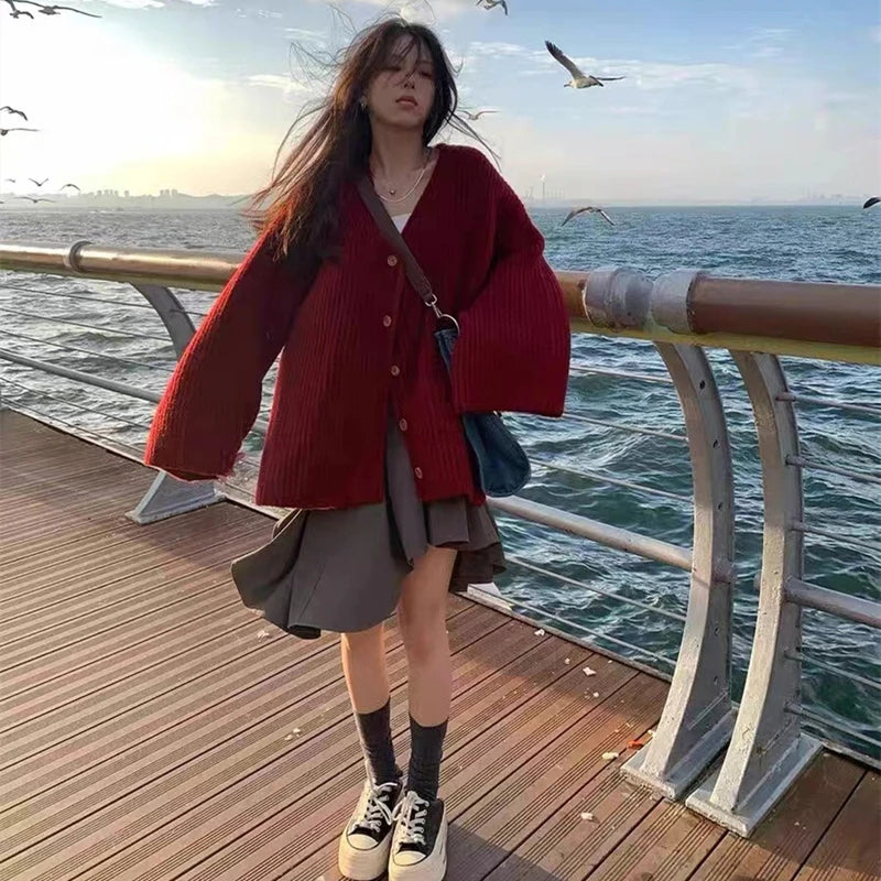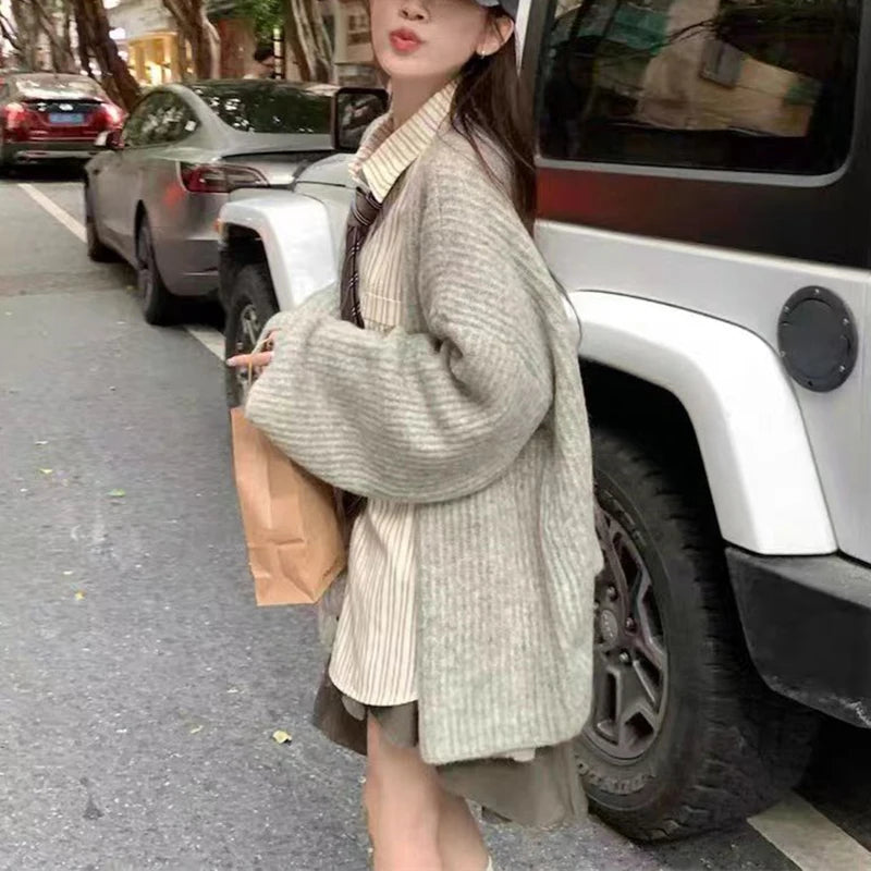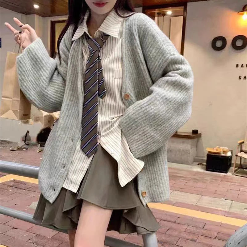 Striped Knit Sweater Women Loose Fashion High Street Long-sleeved Fall Winter Button Cardigan Harajuku JK Lazy School Jumpers