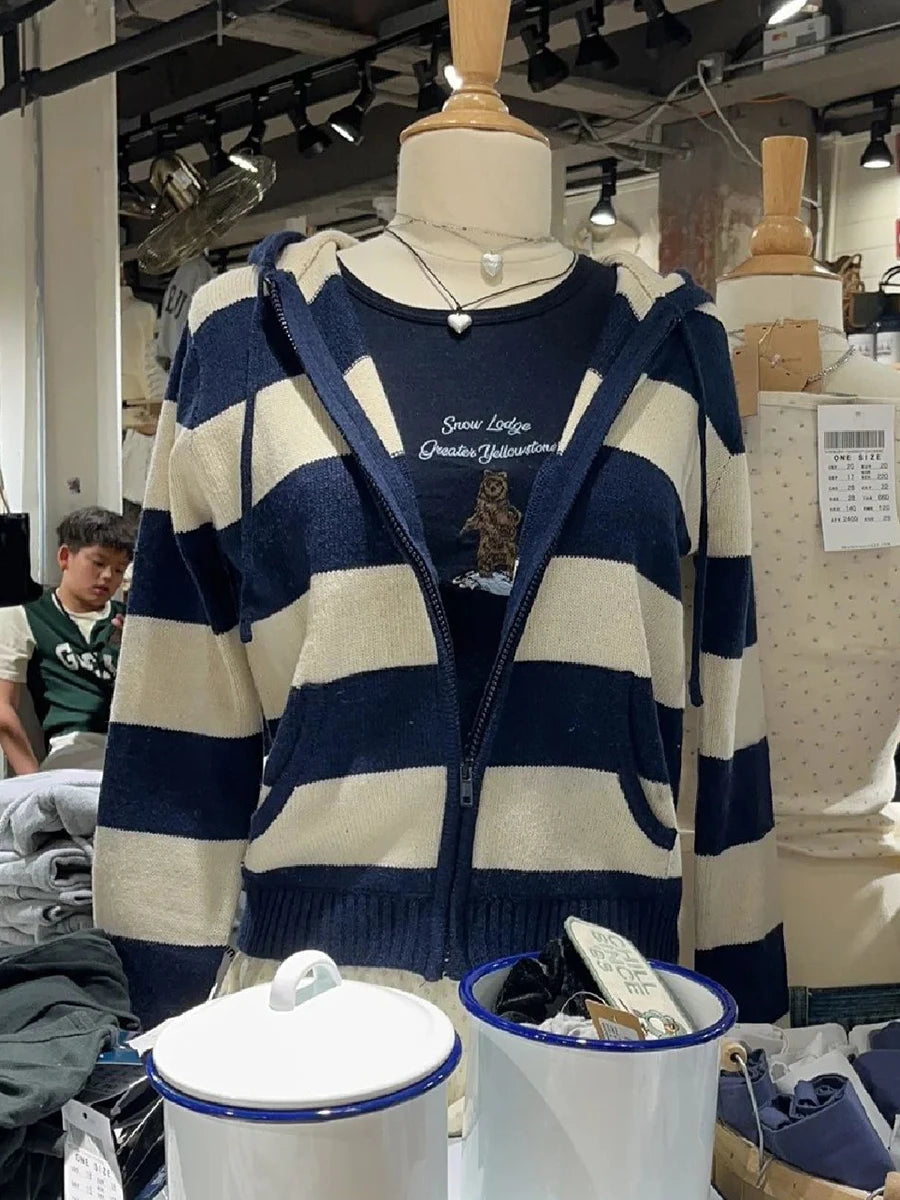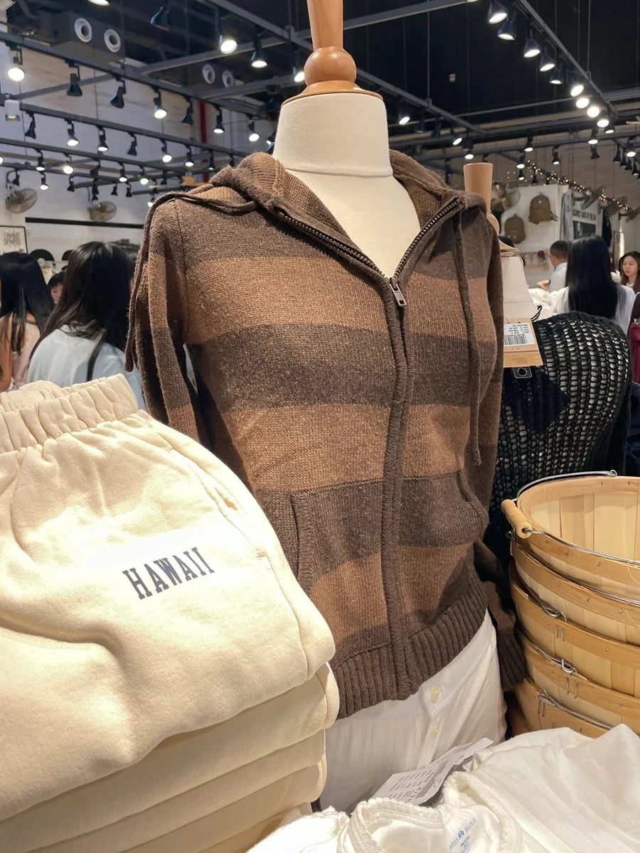 Striped Knitted Cropped Sweater Cardigan Women Autumn Long Sleeve Hooded Zipper Short Streetwear Knitwear Sweaters Y2K Crop Tops