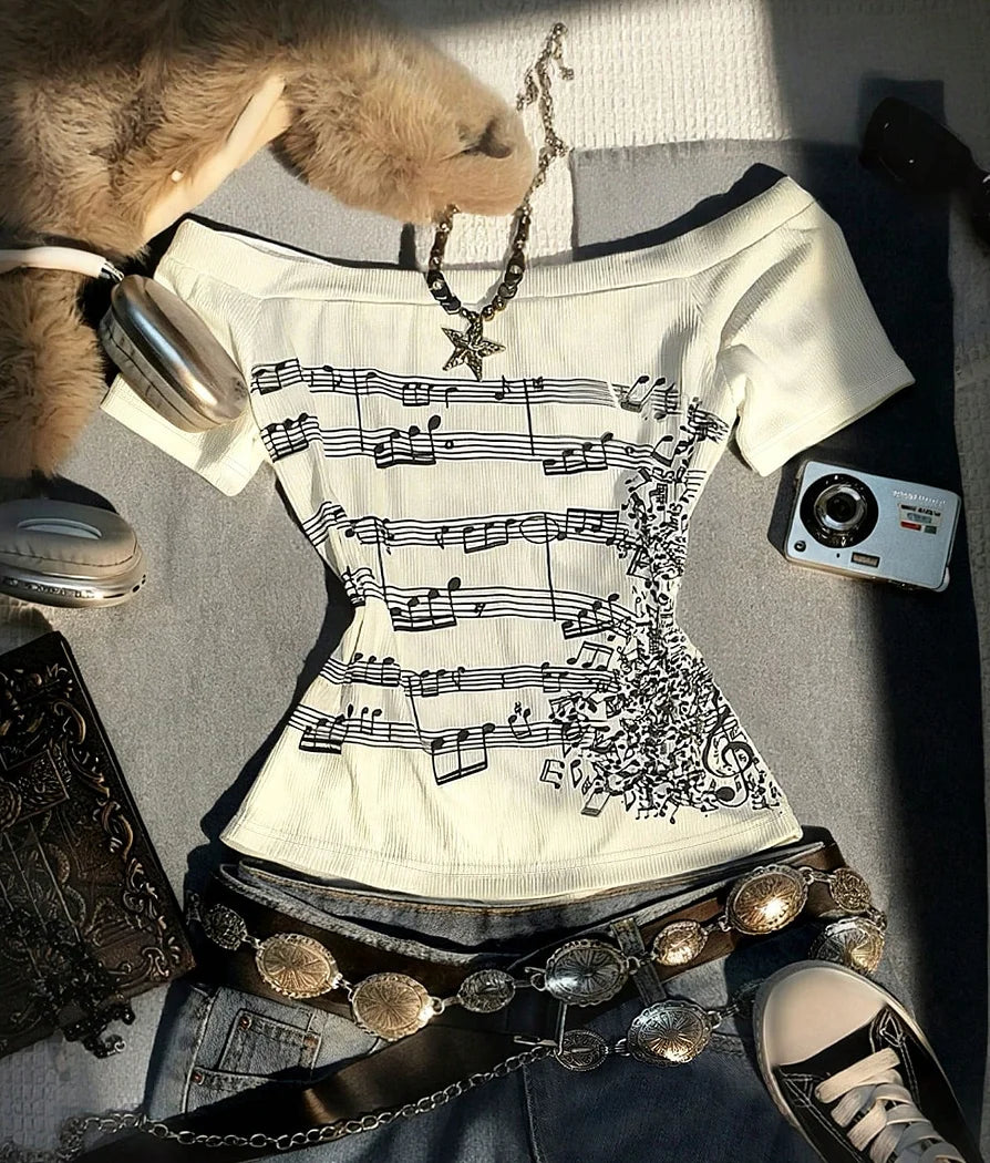 Women's Retro Off-Shoulder Long-Sleeved Slim-Fit T-Shirt, Adorned With Musical Note Print, Fashionable, Y2K Retro Style, High-Qu